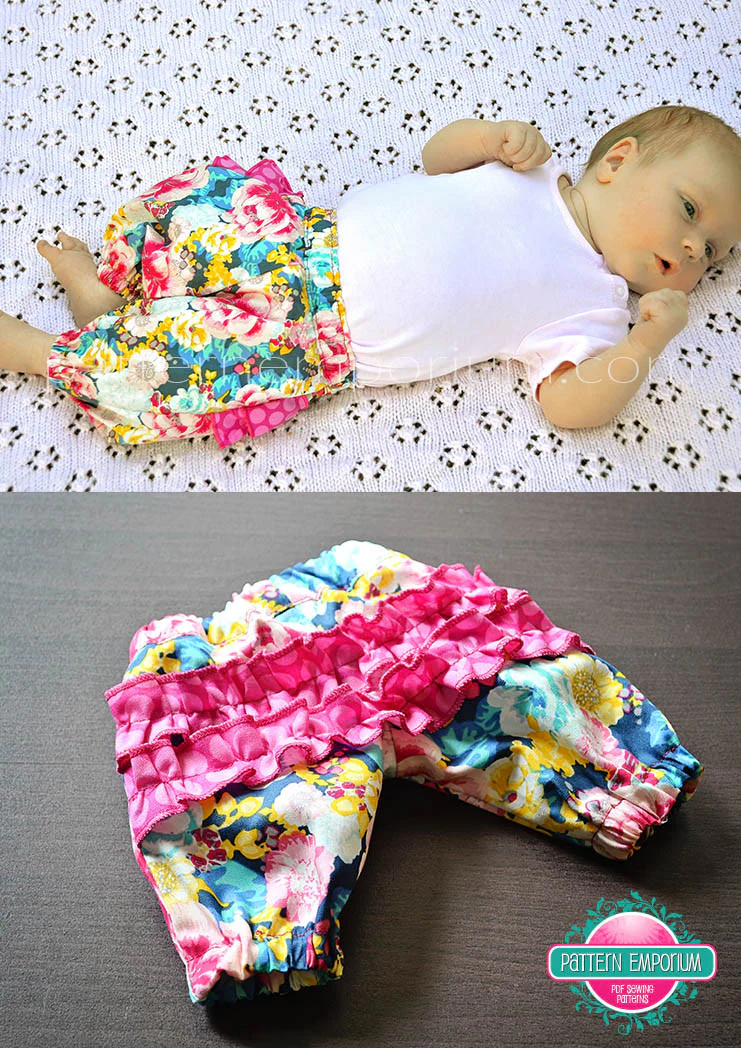 Choose from frilly side seams, plain harem pants, or ruffled bottoms, with options to create matching doll pants as well.