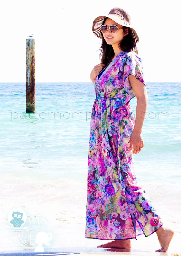 The SunKissed Kaftan sewing pattern features a range of v-necklines - high, mid, low & plunging. Sew a top, dress or maxi. It is an easy to wear style; perfect for summer days by the pool or at the beach.
